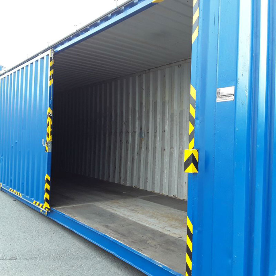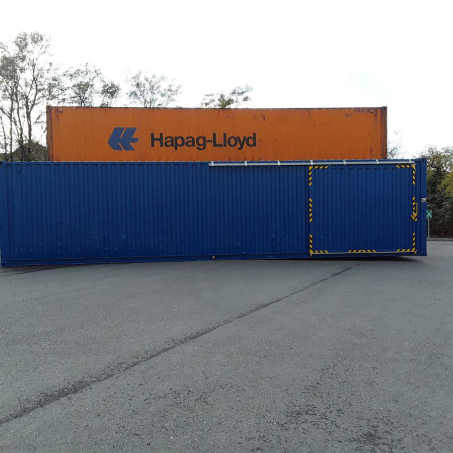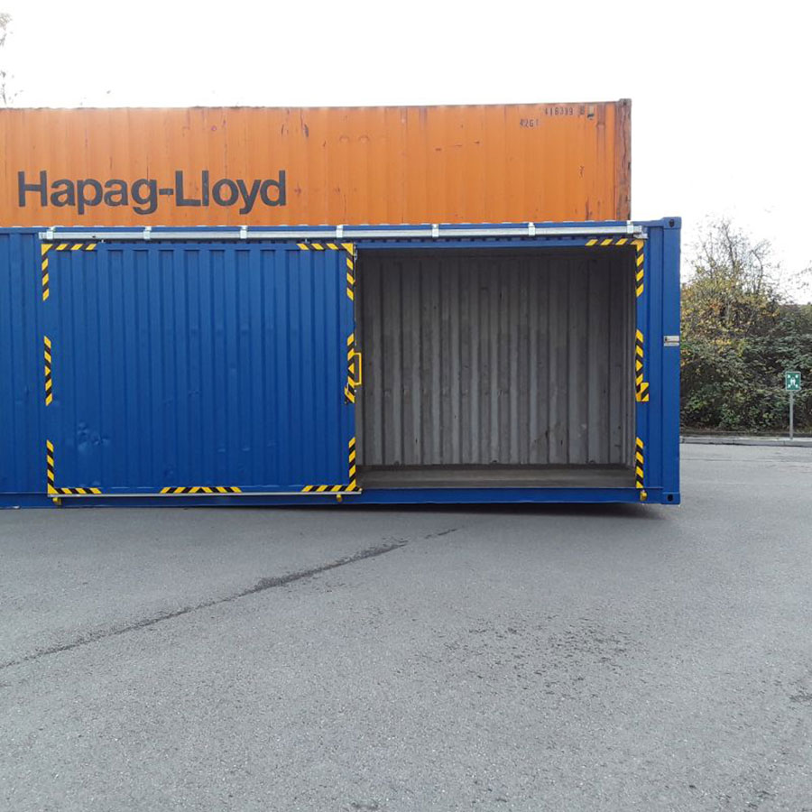 Entsprechend Ihrem Bedarf passen wir die 20 und 40 Fuß Seecontainer an. Die seitliche Öffnung kann dabei rechts, links oder mittig platziert werden. Über ein ein- oder zweigleisiges Schienensystem werden die Tore entsprechend montiert. Ein hochwertiges Sicherheitsschloss sorgt für die notwendige Absicherung Ihrer Güter.