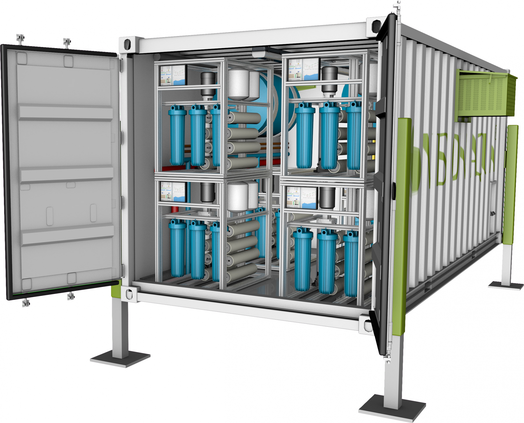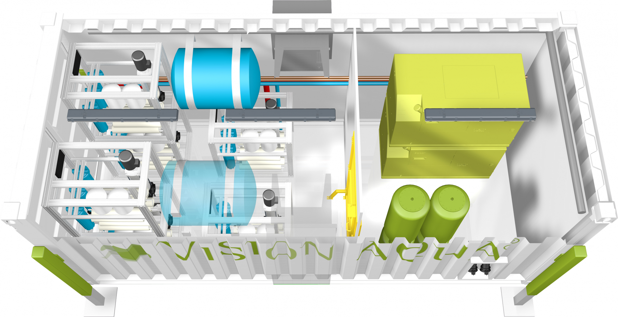 Wir unterstützen unseren Partner VISION AQUA® Technology GmbH bei der Realisierung deren Anlagen für die Aufbereitung von Süßwasser, Brackwasser, sowie chemisch kontaminiertem Wasser aus nahezu allen natürlichen Quellen. Dafür bauen wir unsere Seecontainer derart um, dass alle nötigen Systemmodule passgenau und sicher installiert werden können.